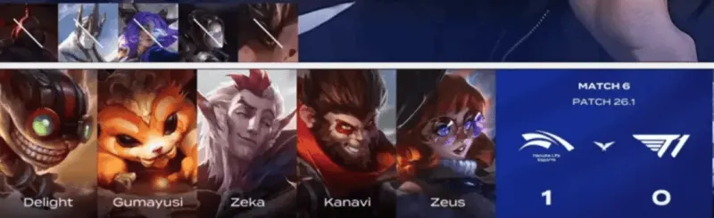 HLE选用:Zeus纳尔、Kanavi猴子、Zeka阿萝拉、Gumayusi炸弹人、Delight洛